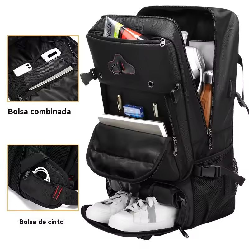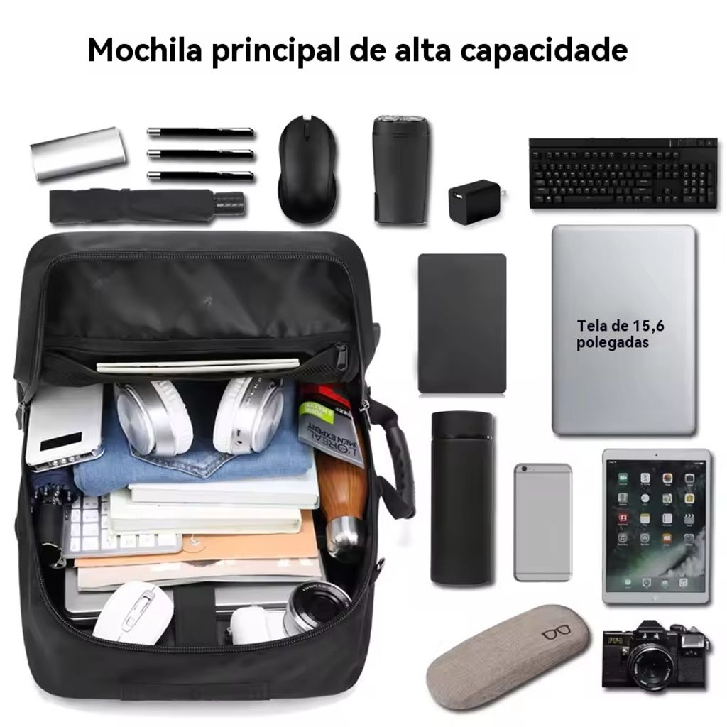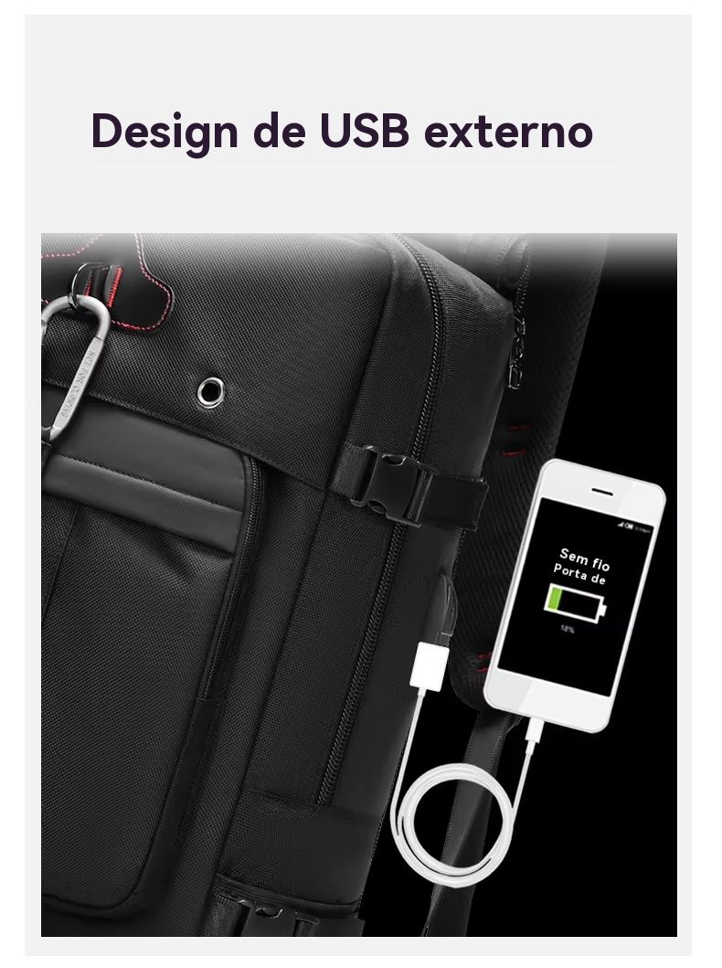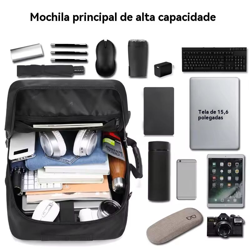 Compartimentos em camadas + bolsos independentes: compartimento dedicado para notebook, área para acessórios digitais, área para materiais de escritório, área para roupas, compartimento para sapatos… Faz com que os itens fiquem “no seu lugar”, não precisando mais vasculhar tudo para encontrar algo 😎!